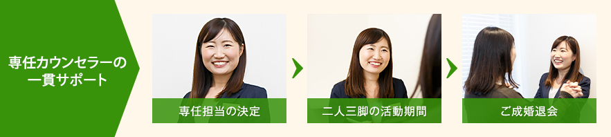 ファーストカウンセリングからご成婚まで、同じひとりの専任カウンセラーが一貫してサポートします。