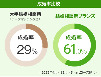 業界トップクラスの高い成婚率61.0%(※2023年4月~12月(Smartコース除く))を実現するための、結婚相談所ブランズならではの3つのこだわりをご紹介します。