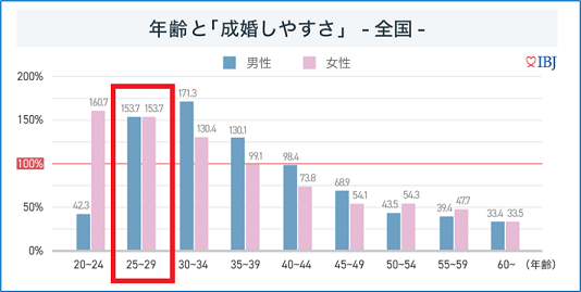 日本結婚相談所連盟が公表する「IBJ成婚白書2022」のデータを見ると、25歳~29歳は男女ともに成婚しやすいことが分かります。