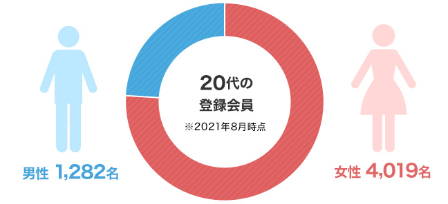 当社の例でいえば、20代の登録会員数は5,301名です。会員様の内訳は男性が1,282名、女性4,019名となります(※2021年8月時点)。