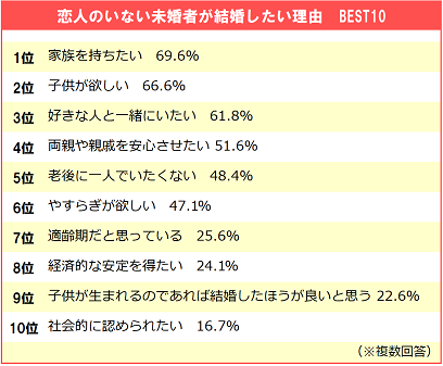 結婚相手がいないけれど早く結婚をしたいと思う理由は、さまざまです。結婚したいと考える恋人がいない未婚者(20代・30代)に対して、国が行った調査を参考に、その理由をいくつか考えてみます。
