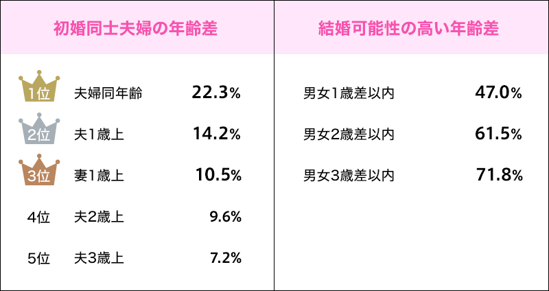 2023年にIBJが公表したデータによると、夫婦の年齢が同じ場合の成婚率が最も多いです。