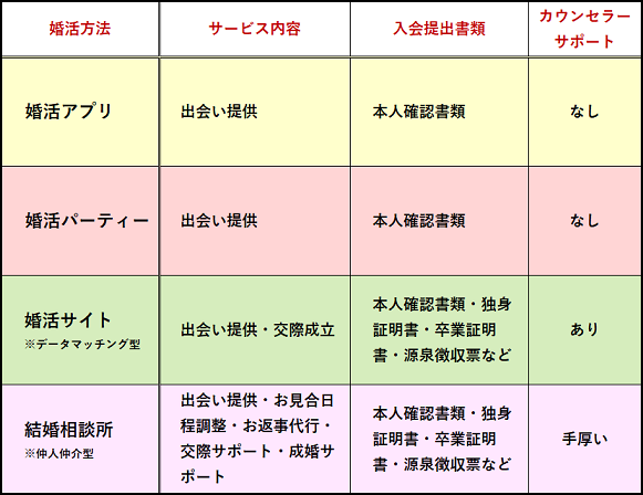 知人主催の合コンや友達の紹介以外でいえば、婚活方法は大きく分けて4つあります。特徴を表にまとめたのでご自身に合った方法を見つけてください。