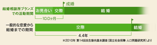 結婚相談所の交際期間は、3ヶ月というルールがあり、最長でも交際期間は6ヶ月と決められています。 そのため、お見合い~ご成婚退会までの平均期間は4~5ヶ月です。そして、成婚退会~ご結婚までの平均期間は6~8ヶ月となるため、 お見合い~ご結婚までの期間は、10ヶ月~13ヶ月となります。
