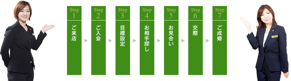 結婚相談所ブランズでは、一人ひとりのご希望をお伺いしながら、プロセスごとの目標を、専任カウンセラーと一緒に設定していきます。オーバーペースやスローペースなどの軌道修正が必要なときは、あなたの専任カウンセラーがペースメーカーとなって、サポート・フォローアップします。