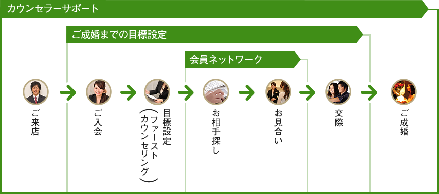 成婚率=「カウンセラーサポート」×「会員ネットワーク」×「ご成婚までの目標設定」。